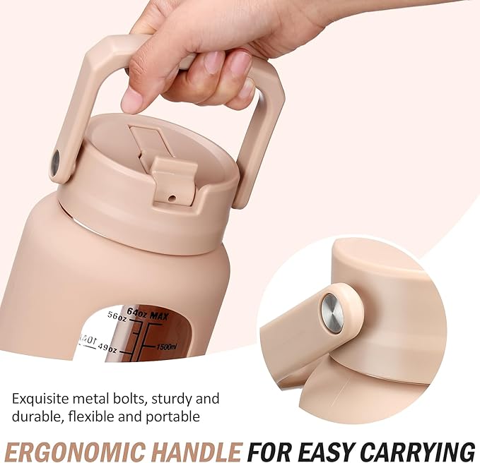 - ADVANCED HANDLE - NOLOGLAZIC half gallon water bottle features a lightweight yet durable plastic handle with a sturdy metal bolt connection, ensuring robust weight-bearing capabilities. The upgraded ergonomic design aligns with natural gripping habits, providing a comfortable hold with anti-slip and anti-sweat features. Say goodbye to ordinary handles and embrace a more powerful and thoughtful design, delivering outstanding quality and comfort to your hydration experience.