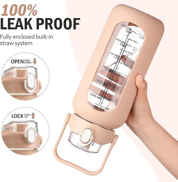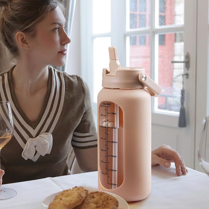 - TIME MARKERS - Our water bottle with time marker 64 oz features time reminders for effortless daily hydration tracking. The clear markings on the glass ensure easy readability and mastery of your water intake goals.