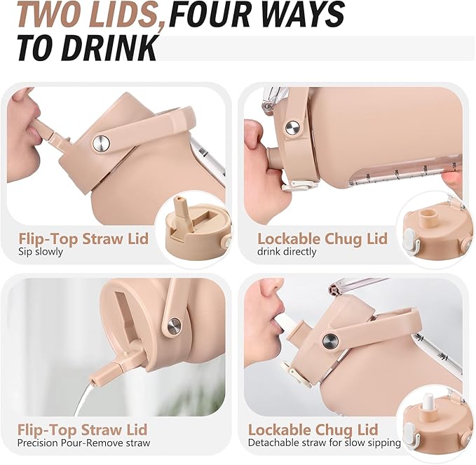 - FLEXIBLE DUAL LID DESIGN - This water bottle features two unique lids: a flip-top straw lid for slow sipping and a lockable chug lid for quick hydration. The built-in straw system is fully enclosed, making it practical and leak-proof for your beverage safety.