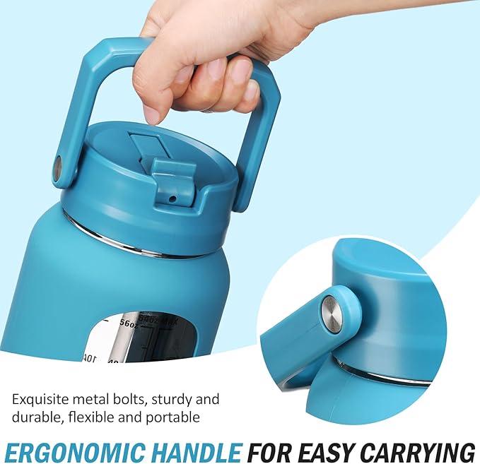 - ADVANCED HANDLE - NOLOGLAZIC half gallon water bottle features a lightweight yet durable plastic handle with a sturdy metal bolt connection, ensuring robust weight-bearing capabilities. The upgraded ergonomic design aligns with natural gripping habits, providing a comfortable hold with anti-slip and anti-sweat features. Say goodbye to ordinary handles and embrace a more powerful and thoughtful design, delivering outstanding quality and comfort to your hydration experience.