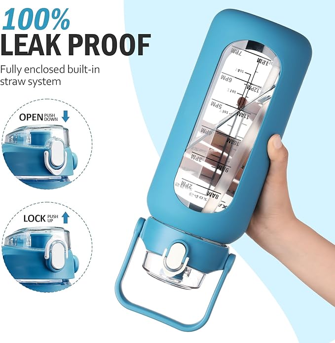 - TIME MARKERS - Our water bottle with time marker 64 oz features time reminders for effortless daily hydration tracking. The clear markings on the glass ensure easy readability and mastery of your water intake goals.