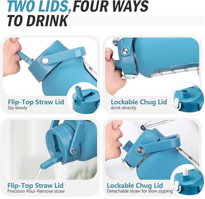 - FLEXIBLE DUAL LID DESIGN - This water bottle features two unique lids: a flip-top straw lid for slow sipping and a lockable chug lid for quick hydration. The built-in straw system is fully enclosed, making it practical and leak-proof for your beverage safety.
