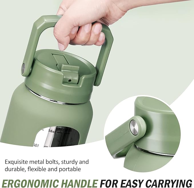 - ADVANCED HANDLE - NOLOGLAZIC half gallon water bottle features a lightweight yet durable plastic handle with a sturdy metal bolt connection, ensuring robust weight-bearing capabilities. The upgraded ergonomic design aligns with natural gripping habits, providing a comfortable hold with anti-slip and anti-sweat features. Say goodbye to ordinary handles and embrace a more powerful and thoughtful design, delivering outstanding quality and comfort to your hydration experience.