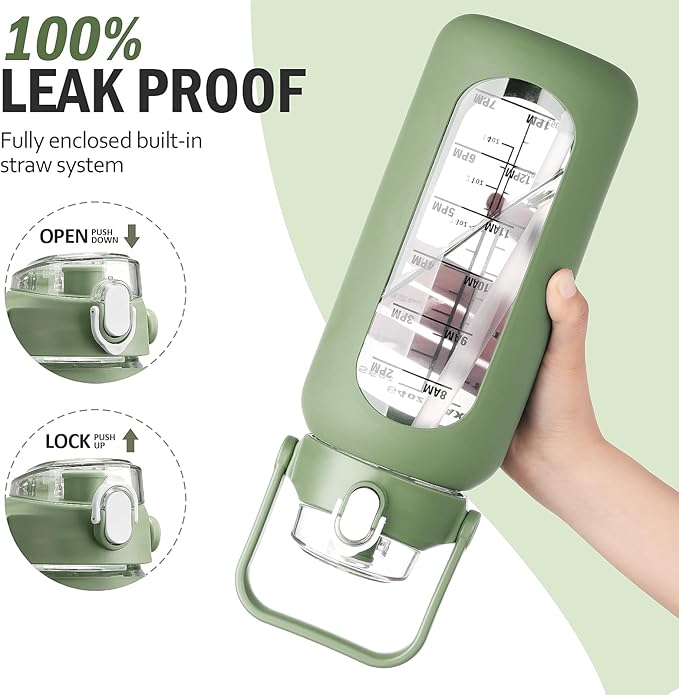- TIME MARKERS - Our water bottle with time marker 64 oz features time reminders for effortless daily hydration tracking. The clear markings on the glass ensure easy readability and mastery of your water intake goals.