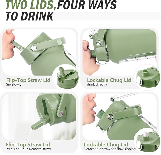 - FLEXIBLE DUAL LID DESIGN - This water bottle features two unique lids: a flip-top straw lid for slow sipping and a lockable chug lid for quick hydration. The built-in straw system is fully enclosed, making it practical and leak-proof for your beverage safety.