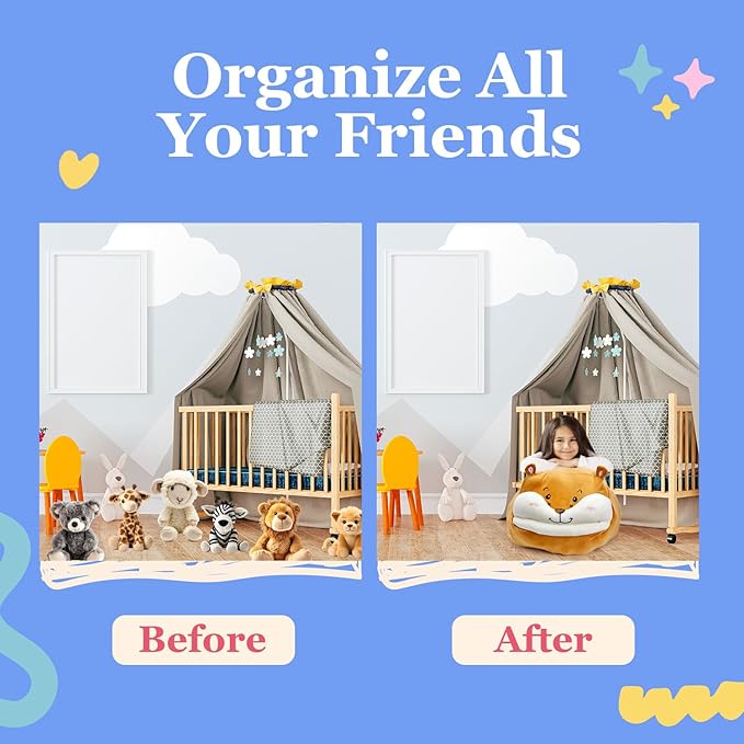 - CUTE 2in1 STORAGE SOLUTION: Store your childrens stuffed animals out of the way while also getting them a bean bag chair! Stuffing the bag makes for a fun activity after which you will have a cute comfy furniture piece! Our chair is great for kids of all ages from toddlers to teens!