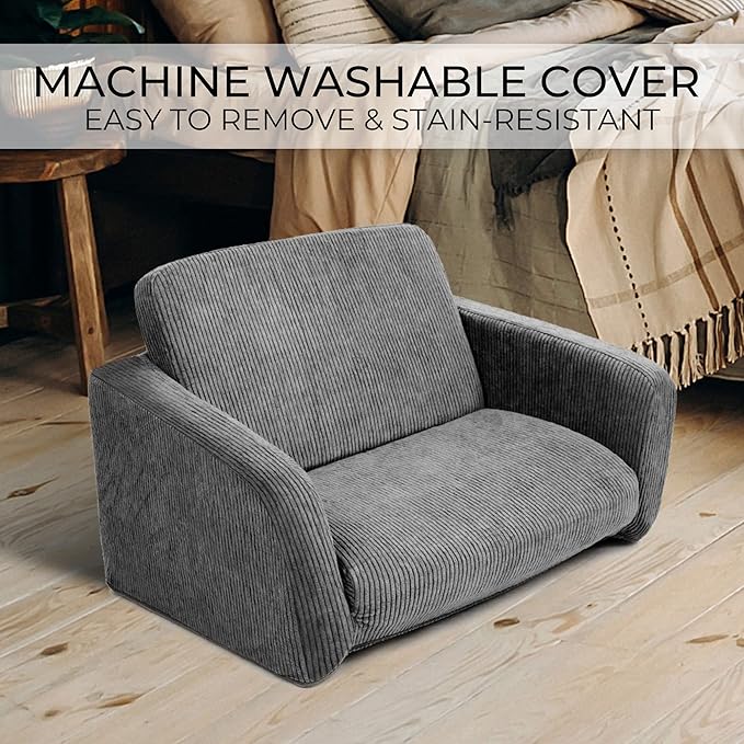 - Stylish 2-in-1 Convertible Feature: Your kids will simply love the kids sofa (recommended age: 18+ months)! Chic in classic gray, the 22x16.5x15” kids couch delights with its double duty: easily switch from chair into a snug lounge position (22x41x11.5”)