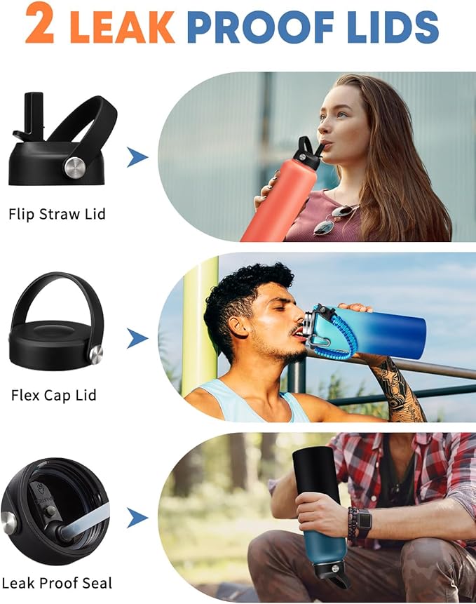 - LEAK-PROOF 2 LIDS OPTION: The stainless steel water bottle 40oz metal flask water bottles is equipped with two individual lids to keep beverages fresh and intact all day without transfer of flavor. The wide mouth flex lid for easy drinking and strong tightness for no leaks when you're on the go. The hands-free straw lid for spill-proof sipping and the package comes with an alternative straw & a straw brush for easy cleaning