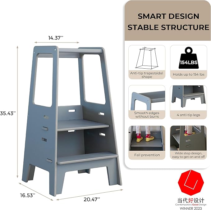 - Contemporary Good Design Winner 2023: Revel in ample standing space with our kitchen step stool, surrounded by comprehensive protection to prevent accidental falls. Engineered for safety, it creates a secure environment for every use, giving you peace of mind while your child explores.