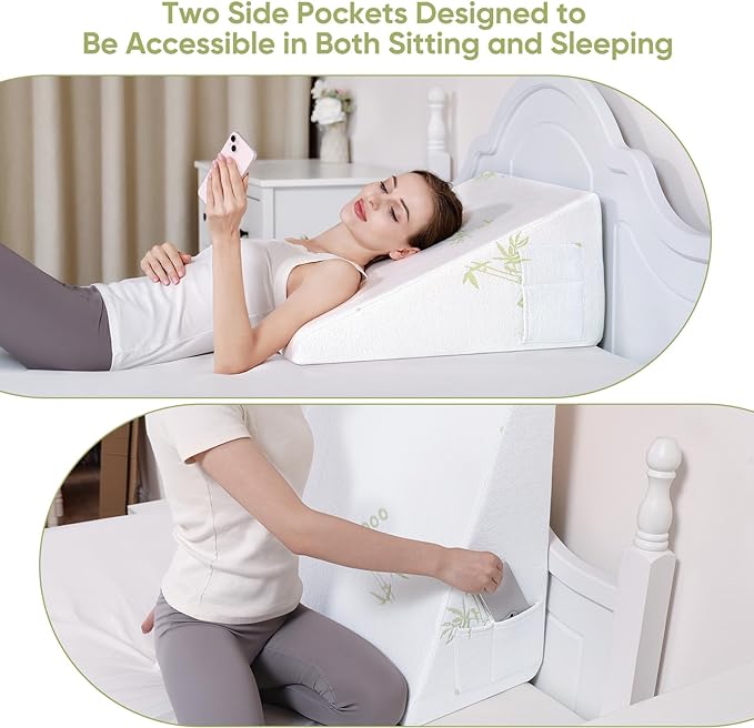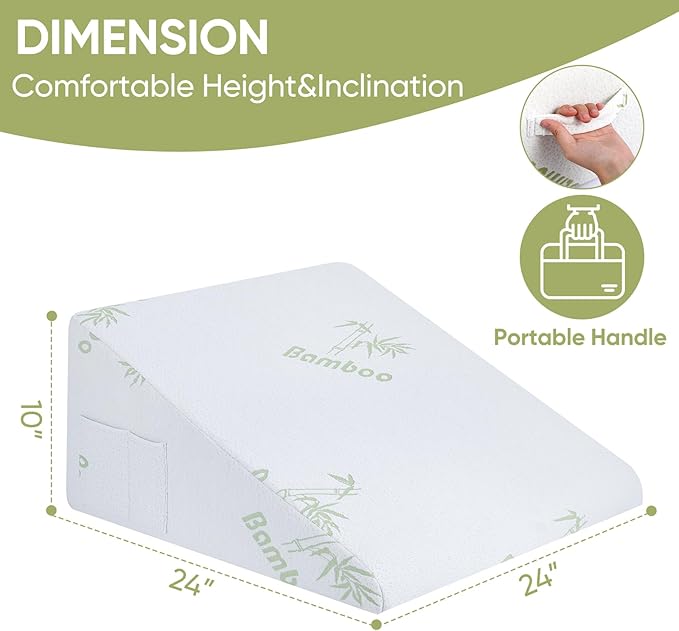 - 【STORAGE POCKET& PORTABLE HANDLE】: This pillow wedge has two side pockets with different orientations that can store your phone, glasses, and remote control.Portable handle for easy transport.The non-slip fabric at the bottom ensures the pillow stays in place for a peaceful sleep.
