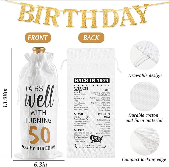 - [CREATIVE 50TH BIRTHDAY WINE BAG] - Paired with the 50th birthday linen cotton wine bag printed with the words "BACK IN 1974" and "Pairs Well with Turning 50 Happy Birthday" on the 50th birthday wine tumbler. Convenient for you to bring another bottle of wine to share with friends. It can serve as both a fashionable wine glass carrier and a precious souvenir, reminding everyone of how unique the world was in the year you were born.