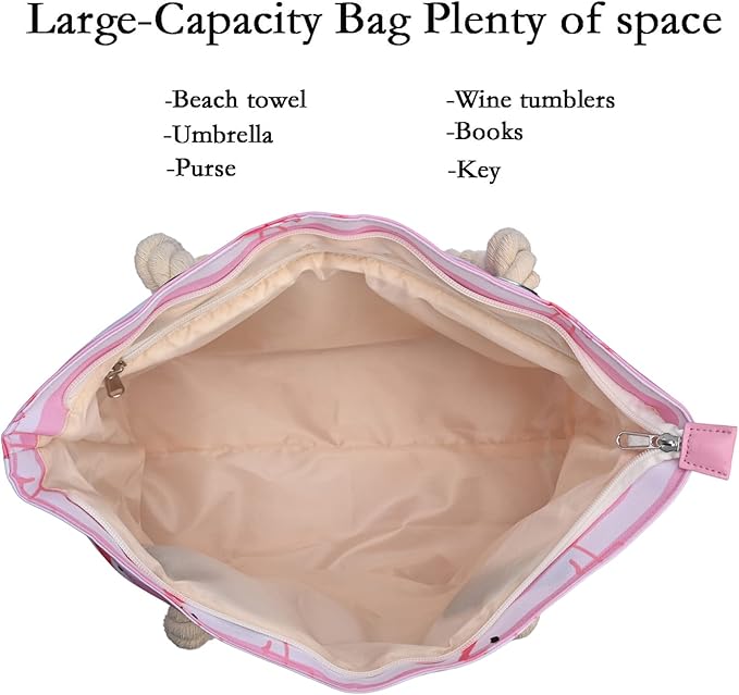- LARGE BEACH BAG:Size at L16.54"xH13.39"xW5.5",Fully functional design with a stylish lined interior with side pockets, there is enough space to keep your lipsticks,cosmetics,beach towel,beach hat,flip flop,sunscreen and sunglasses,swimsuit and other necessities.