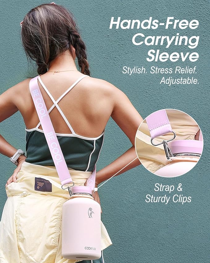 - Unleash Your Style, Hands-Free: Elevate your fashion game with this half gallon water bottle's exquisite adjustable shoulder straps and eye-catching design. Whether worn crossbody, single-shoulder, or hand-held, it's a statement piece that complements your vibrant personality.