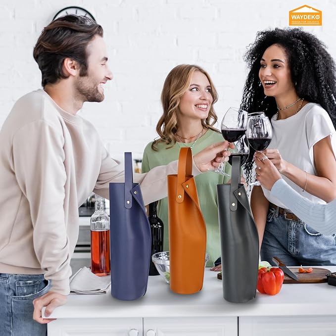 - 1pc Wine Gift Bag, Reusable PVC Leather Wine Tote Carrier, Double Layered Wine Gift bag carrier, Birthdays Bridal Showers Christmas or Other Holidays Gifts Party-Black/Navy Blue/Brown