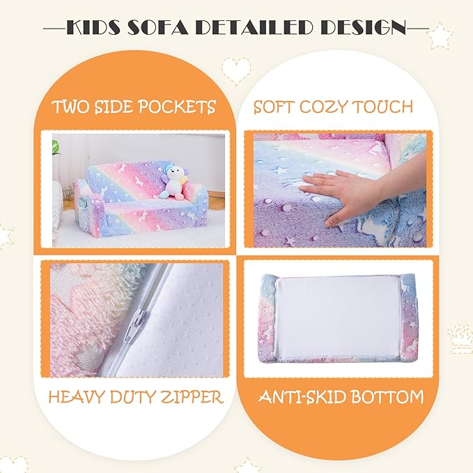 - ✿【SAFETY DESIGN FOR KIDS & TODDLERS】➤ The cover of SUFUS kids sofa couch is made of high quality short plush which is durable, odor-free and Hypoallergenic. The bottom is tailored with anti-skip material to add extra safety. The child-safe hidden zipper is designed to prevent accidental opening by kids or unexpected bites by pets. You could use a paper clip to open and close but don't forget to remove it once you've finished