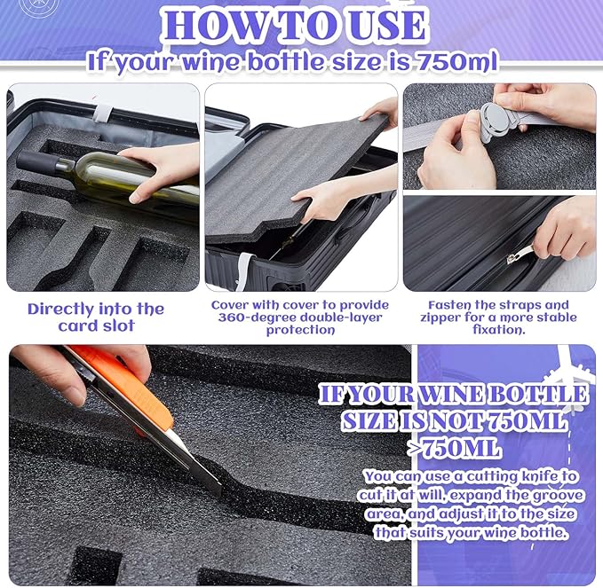 - Enjoy Flexibility: this wine carrier case offers a flexible and creative packing solution; The removable foam inserts ensure its adaptability based on your needs; Remove the foam inserts to utilize more space to hold your clothes or securely hold wine bottles, the choice is yours; The well spaced grooves help hold the bottles firmly, making it ideal for your journey needs