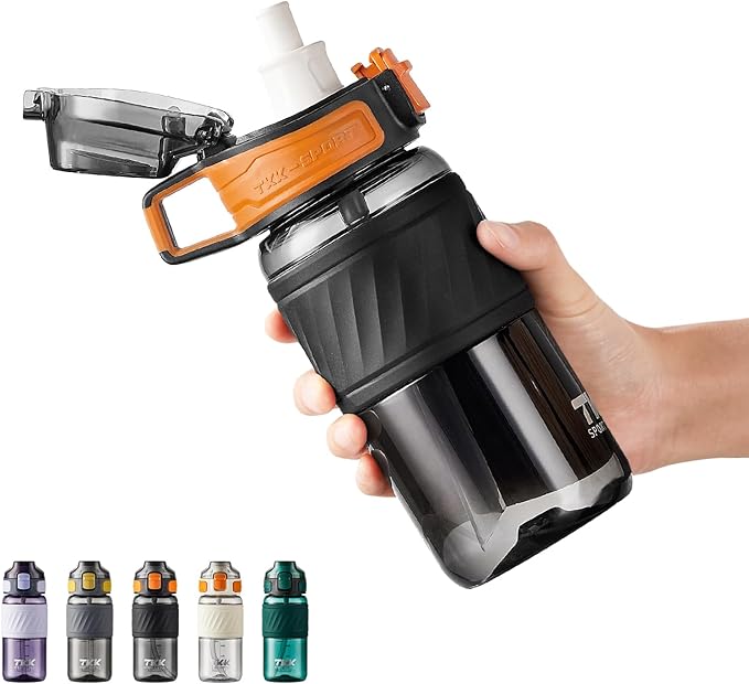 - FLIP TOP LID WATER BOTTLE: Press by the finger on the bottle lid, then it will pop up easily. If you push under the button to lock the bottle mouth, then it can prevent accidentally touching the switch. With the handle and anti sweat grip design, it makes you easier to carry it to anywhere.