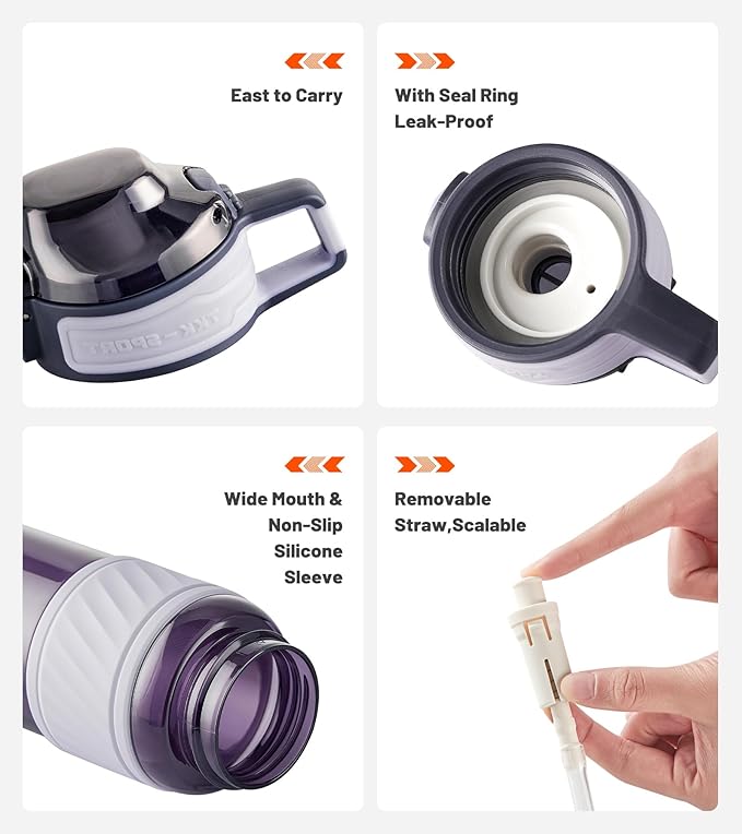 - WATER BOTTLES WITH STRAW: This sports water bottle features food-grade material straw, making it easy for you to grip and sip via the straw lid. One removable straw allows you to enjoy spill-proof sipping or fast water flow. It can also be used without straw, a dual-purpose water bottle.