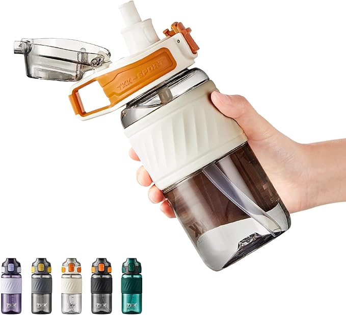 TKK 15oz Sports Water Bottles with Removable Straw Durable BPA Free Tritan Bottles Leak-Proof Water Bottles for School, Fitness, Gym, Outdoor, White