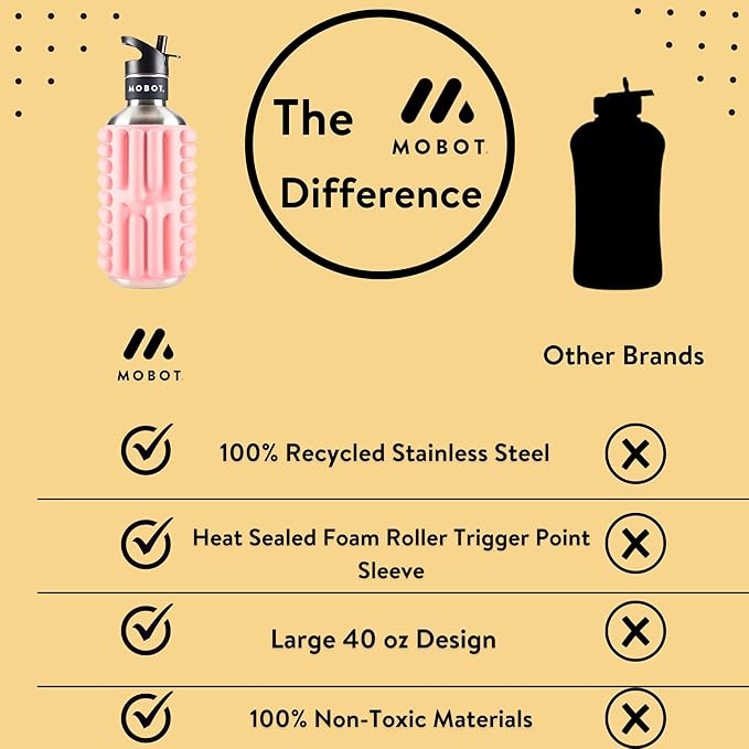 - GYM BOTTLE: Whether you're a seasoned athlete or just starting your fitness journey, our Mobot foam roller water bottle is your ultimate companion, offering hydration, muscle relief, and convenience in one.
