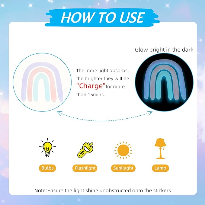 - LONG-LASTING GLOW: To activate the glow, simply expose the rainbow wall stickers to light or sunlight for 30 minutes before use. They will glow in the dark for 8-15 hours, providing a warm and mysterious ambiance. The longer they absorb light, the longer they will stay illuminated at night.