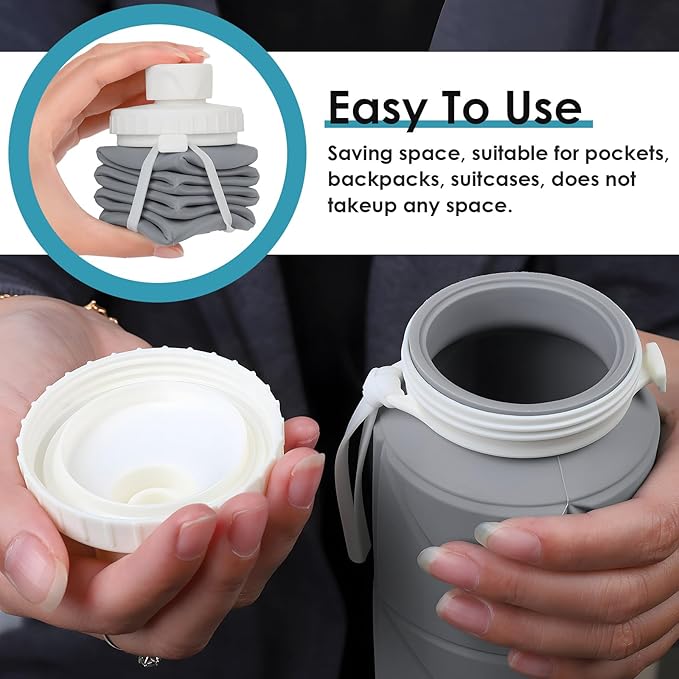 - Portable Convenience: Usage steps:1)Open the bottle cap.2)Pinch the bottom tightlyand twist from the bottom.3)Continue to pinch themiddle and twist it.4)Close the cap and tieit with straps.Say goodbye to bulky, rigid water bottles! Our lightweight and compact collapsible water bottle is your brilliant choice. This versatile and reusable companion attaches effortlessly to your backpack or gym bag, keeping hydration within reach. It even fits neatly in your pocket, purse, or pack.