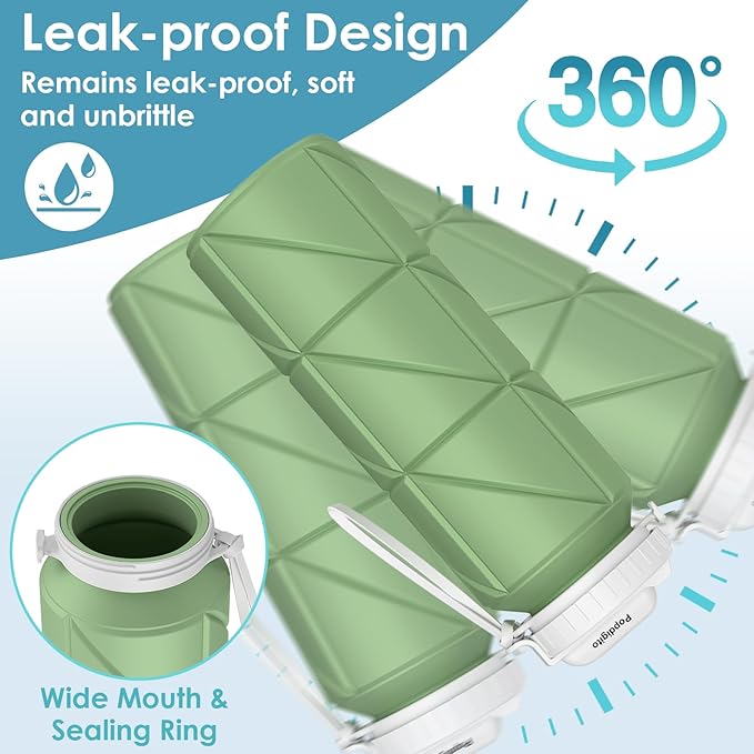 - Water Bottle With Straw And Leakproof Lids:The travel water bottle designed with silicone seal ring to prevent leakage.The patented sealing screw cap is used to eliminate splashing and effectively prevent the bottle from accidentally opening.The wide-mouth design makes it easier to clean the inside of the collapsible soft water container or add ice or lemon to it. When using for the first time,it is recommended to soak in boiling water for 10 minutes for thorough cleaning.