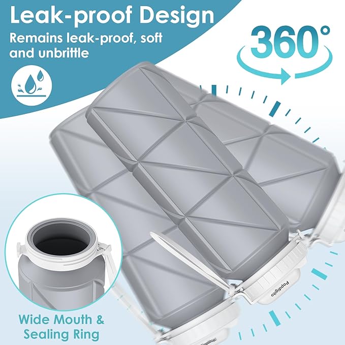 - Stay Hydrated with Ease:Collapsible water bottles 23.3oz(690mL) portable silicone bottle is a foldable type. , from small pocket-sized bottles to larger ones that can hold up to 23.3 ounces of water. Many of them also feature a built-in straw and straps, making it easy to attach them to a backpack or belt loop for hands-free carrying. It weighs only 150 grams and folds down to 2.9 inches in height and 2.6 inches in width when empty.
