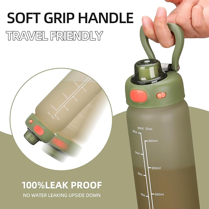 SIEROZUR 32 oz Glass Water Bottle with Straw and Handle Large Sports Motivational Water Bottle with Locking Lid and Time Marker Leakproof Water Jug for Daily Hydration Intake BPA Free