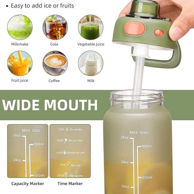 - Leakproof & Functional Design - Simply open with one hand by clicking the button, The flip-top lid is designed with a secure lock, making it dust-proof and leak-proof. The water bottle with a straw makes you drink more easily. The wide mouth is easy to fit ice cubes, and also easy to clean. (bonus cleaning brush)