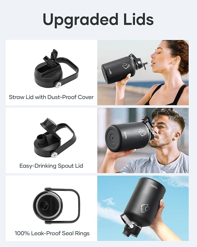 - Upgraded Lids & Handle: This Stainless Steel water bottle features two enhanced lids: a staw lid with dust-proof cover and a easy-drinking spout lid, both equipped with 100% leak-proof seal rings. The reinforced, larger handle offers unmatched durability and portability, making it your perfect on-the-go companion. Also, each lid has a thickened sealing ring, which guarantees 100% leak proof.