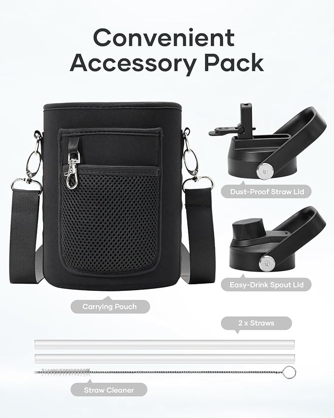 - Accessories & Warranty: With every purchase, you'll get a set of practical accessories and a lifetime warranty. The pack includes 1 x carrying pouch, 2 x lids, 2 x straws, and 1 x straw cleaner. This bottle is ideal for camping, hiking, cycling, running, gym sessions, or outdoor work, ensuring you stay hydrated wherever you go.