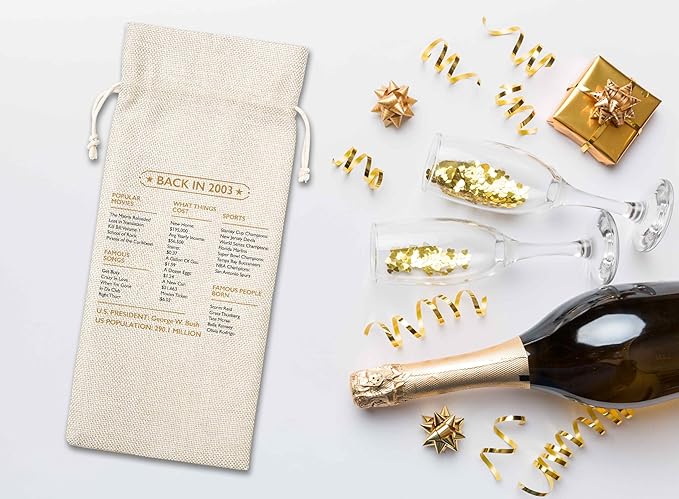 - Perfect Gift: A thoughtful gift for parties and dinners to celebrate and enjoy the happiness. The back of our birthday wine bags features born year popular movies, famous song, world population, sports, cost and famous people born in the same year. These events will remind you of the days of born and are a memorable birthday gift decoration.