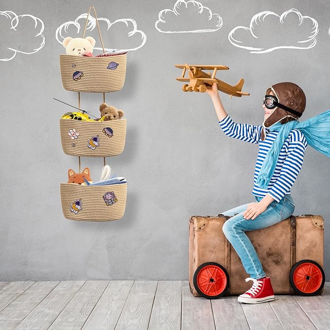 TeoKJ Over The Door Hanging Baskets, 3-Tier Woven Cotton Storage Organizer with Hooks Wall-Mounted with Self Adhesive Space Astronaut Stick Decorative Hanging Nursery Baskets - Jute