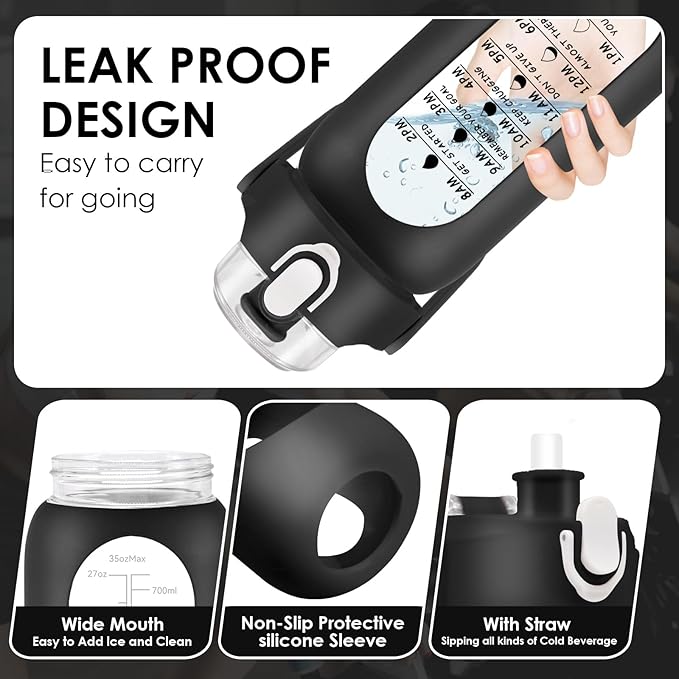 - PORTABLE WATER BOTTLE WITH TIME MARKER - This large sports water bottle comes with a creative design that includes capacity scale and time markers. It allows you to easily monitor your daily water intake and stay hydrated throughout the day. The heavy duty glass bottle with protective silicone case makes it easy to carry and attach to a bike or backpack, making it perfect for gym workouts, school, and other activities.