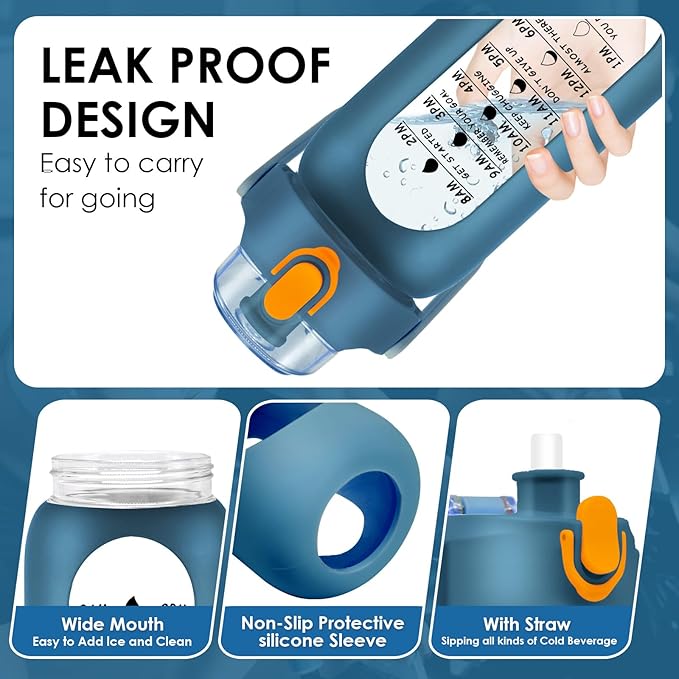- PORTABLE WATER BOTTLE WITH TIME MARKER - This large sports water bottle comes with a creative design that includes capacity scale and time markers. It allows you to easily monitor your daily water intake and stay hydrated throughout the day. The heavy duty glass bottle with protective silicone case makes it easy to carry and attach to a bike or backpack, making it perfect for gym workouts, school, and other activities.