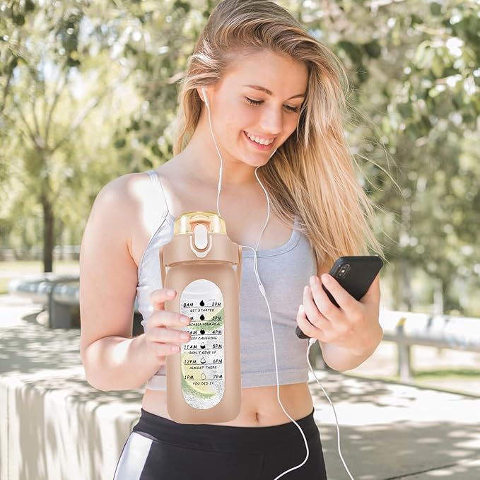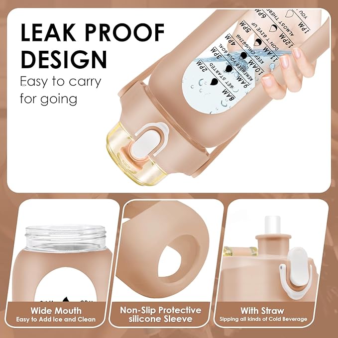 - PORTABLE WATER BOTTLE WITH TIME MARKER - This large sports water bottle comes with a creative design that includes capacity scale and time markers. It allows you to easily monitor your daily water intake and stay hydrated throughout the day. The heavy duty glass bottle with protective silicone case makes it easy to carry and attach to a bike or backpack, making it perfect for gym workouts, school, and other activities.