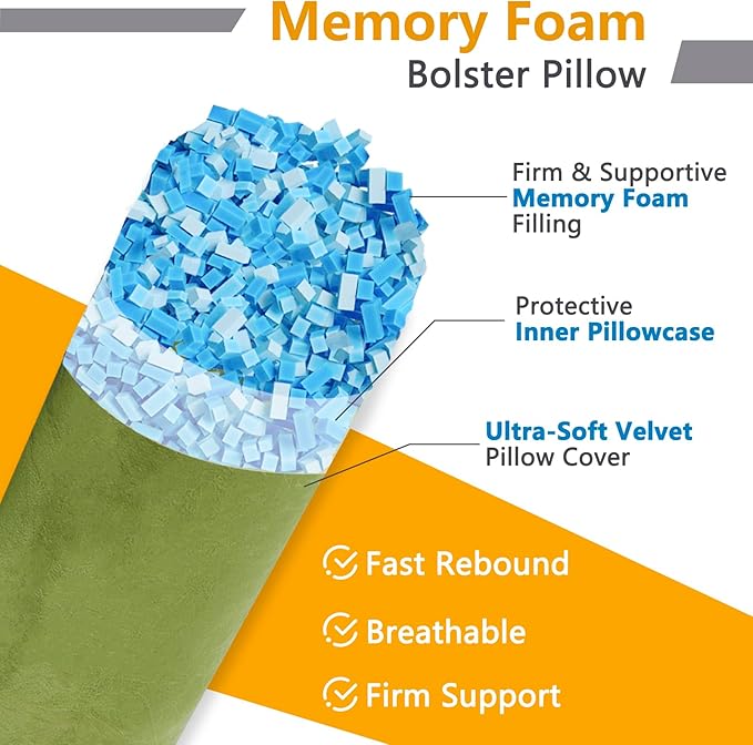 - MEMORY FOAM BOLSTER PILLOWS: Stuffed with high-end shredded memory foam, our bolster pillows set provides outstanding sleeping comfort, memory foam is more breathable and durable, stay firm and never loses shape, making these long round pillows perfect for adults sleeping and support.