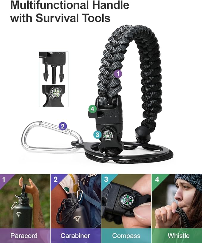 - Ready for adventures: The paracord handle is crafted from sturdy braided rope with an attached survival kit. This includes a compass, a whistle, and a clip, making it an ideal companion for any outdoor activity — be it camping,hiking or exploring new places through travelling.