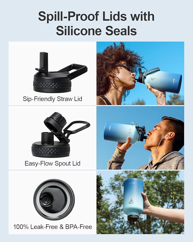- No Leaks, No Worries: This stainless steel water bottle ncludes two leak-proof lids—a straw lid and a spout lid. Both are equipped with silicone rings to prevent any spills or leaks, and are completely BPA-free for your peace of mind.