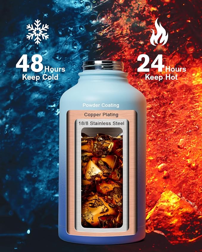 - Cold for 48H & Hot for 24H:Topre 64 oz Half Gallon Insulated Water Bottle features advanced double-wall vacuum insulation with copper plating, the water flask preserve the freshness and temperature of your drinks throughout the day.