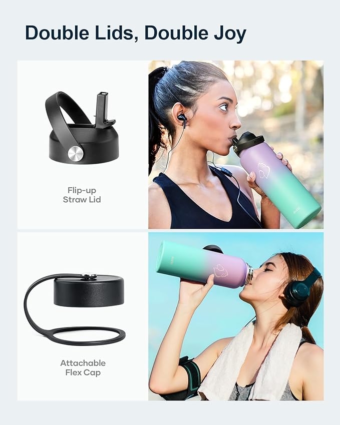 - 2 Lids to Max Its Usability: This stainless steel bottle comes with a straw lid and a flex cap to gear up your games and explorations. Both caps can seal airtight with 100% leak-proof, so you can drink without a spill on the road. *NOTE: ONLY the 22oz and 32oz T-shape bottles fit in any cup-holders*
