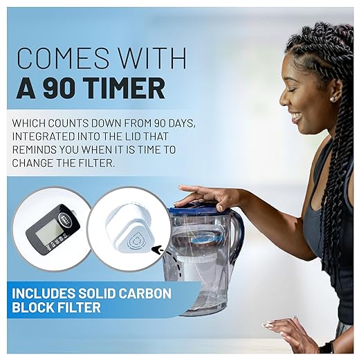 - Space-Efficient and Smart Design: Features include a 10-cup capacity that fits perfectly in your fridge, an intelligent lid for easy refilling and spill prevention, and a long-lasting filter with a 150-gallon capacity. The integrated LED timer reminds you when it's time for a filter change, ensuring optimal performance.