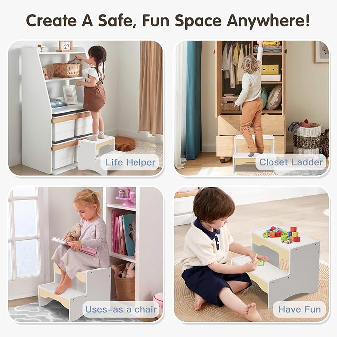 - Safety And Sturdy: This kids step stool constructs of premium MDF wood material, reinforced crossbars have been added to the front and back, making the kids stool's structure more robust and can bearing weight capacity is up to 250 lbs. It can also use as adult step stool for high closet.