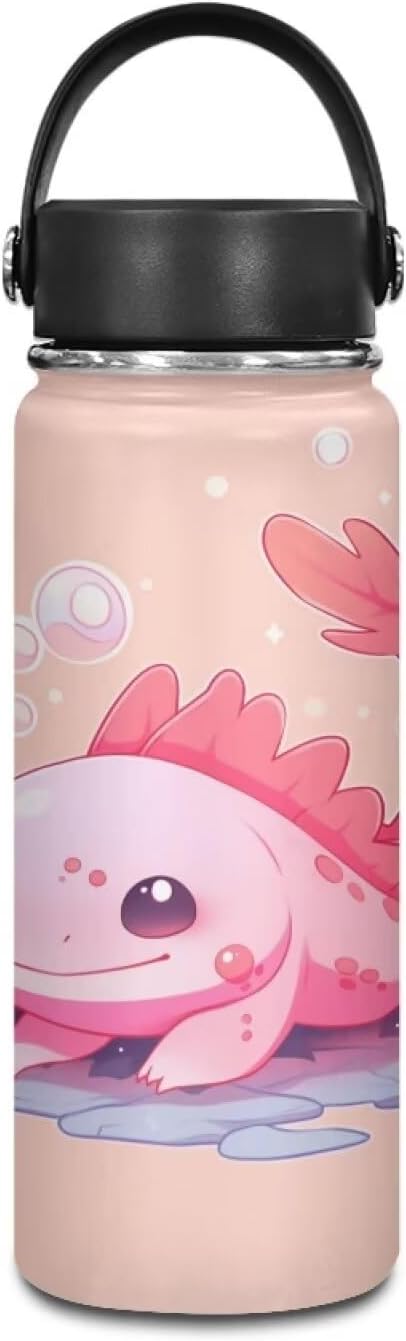 Pink Axolotl Stainless Steel Water Bottle with Handle 20 Oz Vacuum Stainless Steel Reusable Leak & Sweat Proof Gym Sports Travel Water Bottle