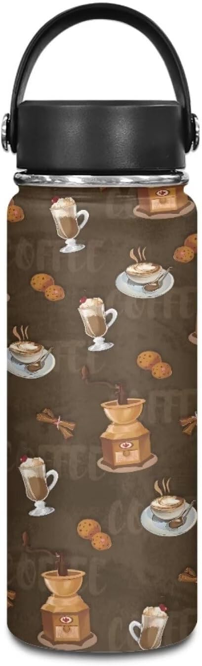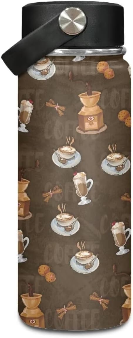 Coffee Print Insulated Water Bottle 20 Oz Stainless Steel Leak Proof Vacuum Easy to Clean Lightweight Keeps Cold and Hot Great for Travel Hiking Biking Running