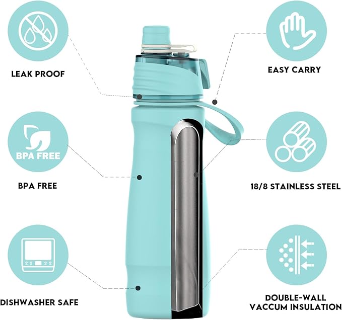 Misting Water Bottle, 24oz Insulated Water Bottle, 2-in-1 Mist & Sip Stainless Steel Water Bottles, Thermo for Hot Drinks/Cold Drinks, Sports Water Bottle for Hiking, Running, Gym, Teal Blue