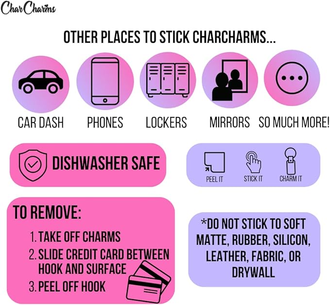 • EASY APPLICATION: No tools needed - just hang these charms on the stick-on hook (not included) for an instant fashionable flair that's perfect for staying hydrated on the go