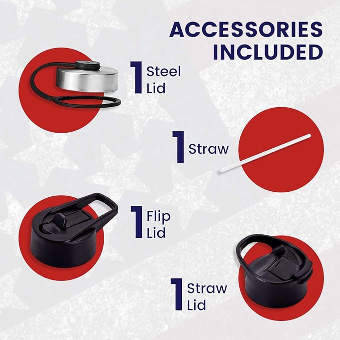 - 3 DIFFERENT LIDS PROVIDED, FOR ALL YOUR NEEDS: with our american flag stainless steel water bottles, we offer 3 different caps: a STRAW LID for easy sipping, a leak-proof METAL CAP for optimal heat retention, and a FLIP-CAP for quick, one-handed closure during activities. Each cap is designed to enhance your experience, whether you're working out, running, exploring the outdoors, or commuting. Choose the one that best suits your needs.