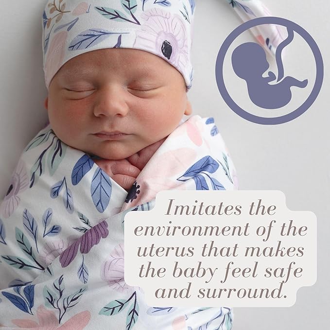 Newborn Baby Girl Receiving Blanket Swaddle Blanket Stretchy Knit Swaddle Set with Matching Headband Beanie with a Name Card (Pink and Purple Floral)